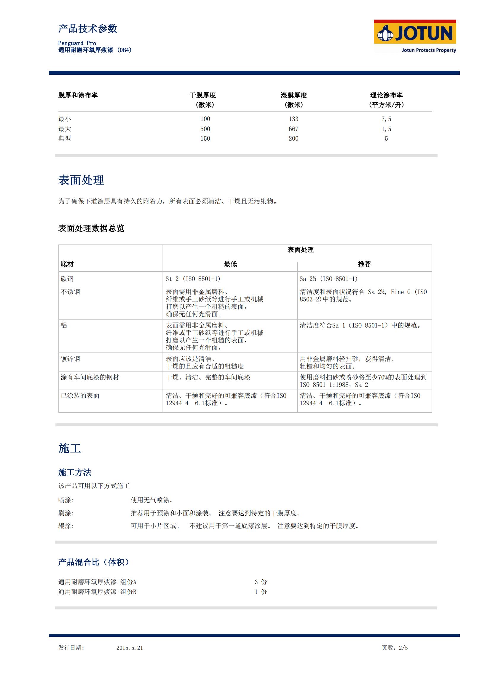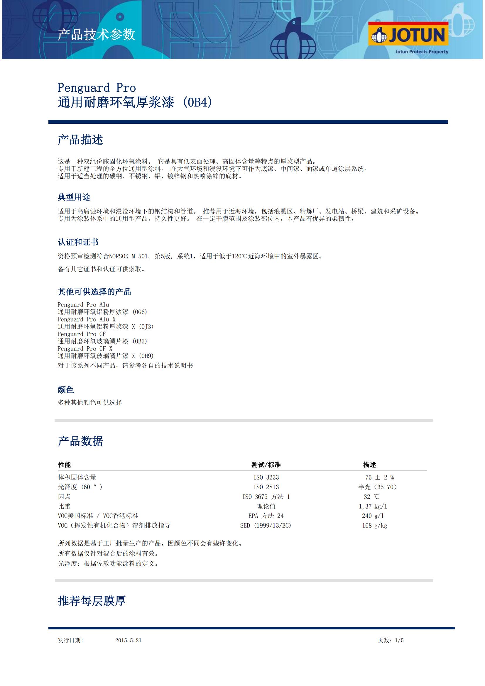 • Penguard Pro 0B4:這是一種雙組份胺固化環(huán)氧涂料。 它是具有低表面處理、高固體含量等特點(diǎn)的厚漿型產(chǎn)品。專(zhuān)用于新建工程的全方位通用型涂料。 在大氣環(huán)境和浸沒(méi)環(huán)境下可作為底漆、中間漆、面漆或單道涂層系統(tǒng)。適用于適當(dāng)處理的碳鋼、不銹鋼、鋁、鍍鋅鋼和熱噴涂鋅的底材。適用于高腐蝕環(huán)境和浸沒(méi)環(huán)境下的鋼結(jié)構(gòu)和管道。 推薦用于近海環(huán)境,包括浪濺區(qū)、精煉廠、發(fā)電站、橋梁、建筑和采礦設(shè)備。專(zhuān)用為涂裝體系中的通用型產(chǎn)品,持久性更好。 在一定干膜范圍及涂裝部位內(nèi),本產(chǎn)品有優(yōu)異的柔韌性